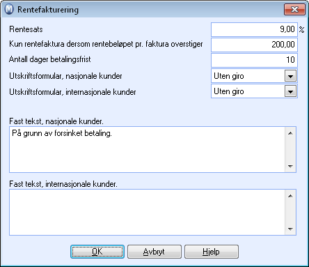 Utskriftsformular, internasjonale kunder: Her bestemmes utskriftsformularet som skal brukes ved rentefaktura til utenlandske kunder.