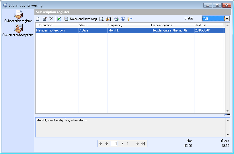 The Subscription register is a window showing all of the different subscriptions you have set up. In the top-right of the window you select whether you want to view active or inactive subscriptions only or whether you want to see all subscriptions regardless of their status.