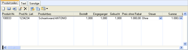 Sie wählen die einzukaufenden Produkte im Einkaufsregister unter der Registerkarte Produktzeilen aus. Notwendige Informationen, etwa zu Preisen und Rabatten, werden dann aus dem Produkt- bzw. Kontaktregister gezogen. Benutzen Sie [Enter] oder [Tab] auf Ihrer Tastatur, um zwischen den verschiedenen Spalten zu wechseln.