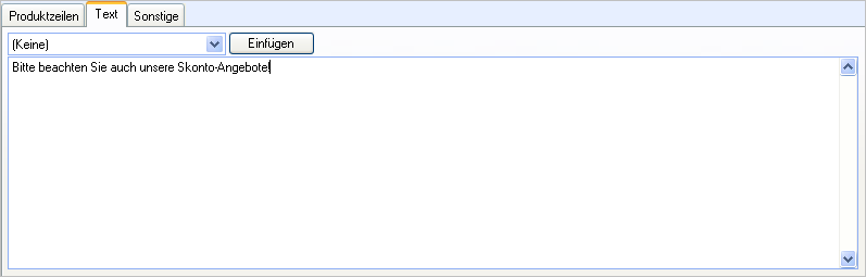Im Einkaufsmodul wird die Registerkarte Text beim Ausdrucken von Einkaufsdokumenten verwendet. Hier geben Sie den feststehenden Text ein, wie er in Einkaufsbestellungen erscheinen soll. Sie können entweder einen Text eingeben, der einmalig für genau diesen Einkauf ist, oder in der Auswahlliste oben im Fenster einen der vordefinierten feststehenden Texte auswählen.