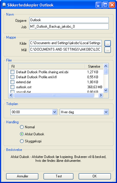 I feltet Kilde tilføjer du mappen, hvor Microsoft Outlook-filen (eller filerne) ligger. På en almindelig installation af Microsoft Outlook er dette normalt C:\Documents and Settings\User Name\Local Settings\Application Data\Microsoft\Outlook.