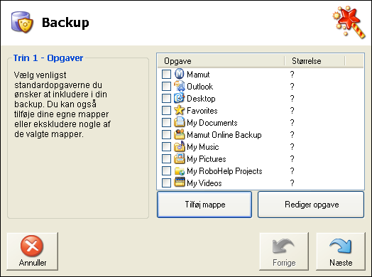 Under Backup finder du en række forhåndsdefinerede opgaver. Du kan imidlertid også sikkerhedskopiere filer fra andre områder på din computer. Disse opgaver definerer og tilføjer du selv under Backup.