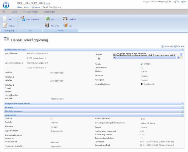 Nederste del af kontakt-vinduet er opdelt i feltfaneblade: Kontaktinformation, Brugerdefinerede felter, Gruppe, Kontaktpersoner and Anden info.