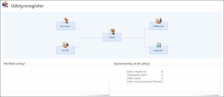 Udover arbejdsområdet Udstyrsregister er der yderligere to informationsområder: Mit udlånte udstyr, som giver dig et hurtigt overblik over udstyr, der i øjeblikket er udlånt, samt Opsummering af alt udstyr, hvor du kan se hvor mange stykker udstyr, du har registreret, og status på dette.