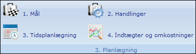 Planlægningsområdet er delt op i fire dele, som hjælper dig gennem alle nødvendige trin. Her kan du definere mål, du ønsker, virksomheden skal opnå det næste år, tilføje handlinger for hvert mål, planlægge hvornår handlingerne skal gennemføres og opsætte forventede indtægter og udgifter for at sikre, at planen er økonomisk realisérbar.