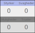 Siden Styrker og Svagheder hjælper dig med at analysere firmaets interne styrker og svagheder. Siden indeholder omfattende spørgsmål din virksomhed, og den hjælper dig til at notere andre vigtige faktorer. Eksempelvis er dygtige medarbejdere en styrke, mens dårlig styringsredskaber vil være en svaghed. En forhåndsvisning til højre viser, hvor mange faktorer, du har defineret.
