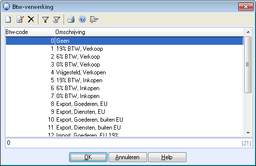 De btw-codes in het programma vormen de basis van de verwerking van de btw. Voor elke code wordt onder andere gedefinieerd welk percentage gebruikt moet worden, of het om inkomende of uitgaande btw gaat en welke standaard verkoop- of kostenrekening moet worden gebruikt bij de boeking. Zodra deze btw-codes vervolgens aan verkopen en/of producten worden gekoppeld, zal een groot deel van de boeking geautomatiseerd worden.