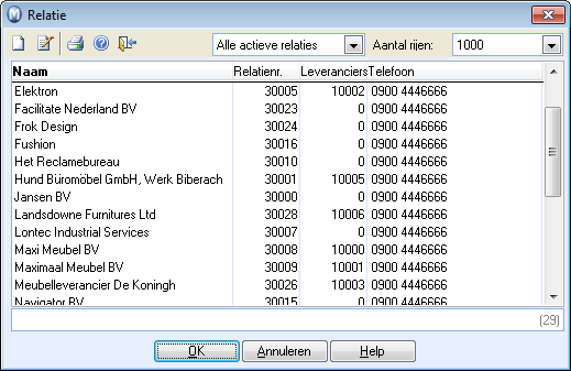 Met behulp van de afrollijst Aantal rijen kunt u aangeven hoeveel relaties in de lijst moeten worden weergegeven. Het programma onthoudt uw keuze, zodat deze gelijk is, de volgende keer dat u de relatielijst opent. Houd er rekening mee dat deze afrollijst alleen beschikbaar is indien u meer dan 500 relaties hebt.
