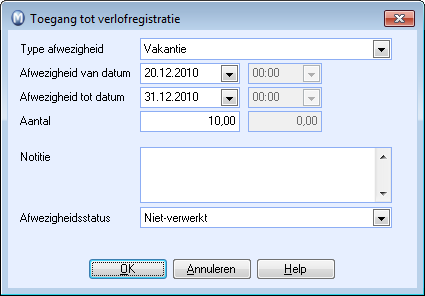 - Gebruik het veld Notities indien u meer gegevens wilt registreren over de reden voor de afwezigheid of vergelijkbare informatie.