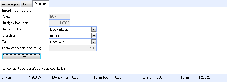 Op het tabblad Diversen in het inkoopvenster worden de valuta-instellingen, taalinstellingen en afronding aangegeven. U geeft ook het doel van de inkoop aan en wordt er aangegeven wie de order heeft aangemaakt of eventueel heeft gewijzigd.