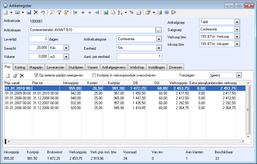 Indien er velden of tabbladen zijn die niet worden weergegeven, of welke u niet wenst weer te geven, kunt u dit aangeven bij de gebruikersinstellingen voor artikel. U kunt aangeven welke functionaliteiten beschikbaar moeten zijn in het artikelregister in de bedrijfsinstellingen voor artikel.