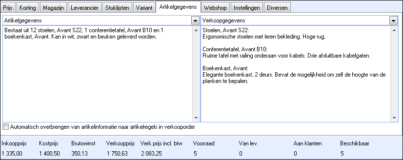 Om tekst van de artikelgegevens automatisch naar de artikelen die aan orders worden toegevoegd, over te brengen naar artikelen, selecteert u de optie Automatisch overbrengen van artikelinformatie naar artikelregels in verkooporder.