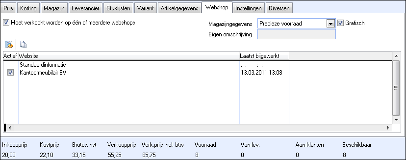 Moet verkocht worden op één of meerdere webshops: Wenst u het artikel te verkopen in uw webshop, dan moet u deze optie selecteren om het artikel beschikbaar te maken in de lijst Artikelen in uw webshop onder Selectie van artikelen.