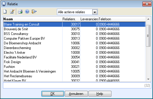 Er wordt nu een order aangemaakt. In alle velden in het bovenste gedeelte van het venster worden de adresgegevens, leverings- en betalingsvoorwaarden ingevoerd zoals deze zijn geregistreerd in het relatieregister. U kunt deze gegevens ook overschrijven. - Klik op Nieuw op het tabblad Artikelregels om een artikel toe te voegen. Herhaal dit voor ieder artikel. Meer informatie over het tabblad artikelregels vindt u in Artikelregels.