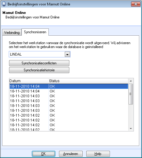 Op het tabblad vindt u tevens een eenvoudige synchronisatielog. De gegevens worden continu gesynchroniseerd, en het venster geeft het tijdstip en status van de laatste 20 synchronisaties weer. Indien er Fout in de kolom Status staat, kunt u de regel selecteren en op de knop Foutmelding klikken om de foutmelding te zien.