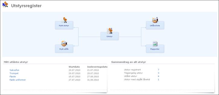 Nederst i arbeidsområdet Utstyrsregister vises to informasjonsbokser: Mitt utlånte utstyr som gir deg en rask oversikt over hvilket utstyr som er utlånt, og Sammendrag av alt utstyr hvor du kan se antall utstyr som er registrert og deres status.
