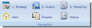 Årsplaneraren öppnas på startsidan. Här påbörjar du din årsplan samt skaffar en översikt över var i processen du befinner dig. Huvudmodulerna i verktygsraden är Strategi, Analys och Planering. Du hittar där även knapparna Hem, Årsplan och Status.