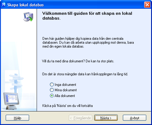 Många användare upplever att de inte har behov för några dokument över huvudtaget när de arbetar frånkopplat. I så fall kan du välja Inga dokument. Därmed kan processen med att skapa en lokal databas gå väsentligt snabbare.