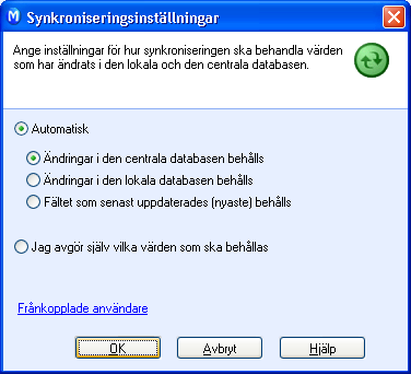 Vid synkronisering kan konflikter uppstå om samma data har ändrats både i den centrala databasen och i den lokala kopian. I det här fönstret kan du ange hur sådana konflikter ska lösas.