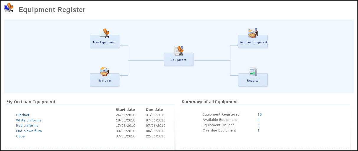 Along the base of the Equipment Register work area you have two information boxes: My on Loan Equipment that provides you with a quick overview of the pieces of equipment that are currently on loan and Summary of all Equipment where you can see how many pieces of equipment you have registered and their statuses.