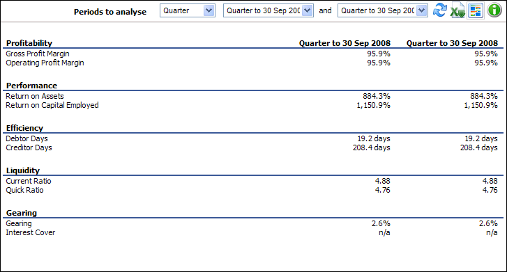 The Mamut Validis Ratio Analysis provides a quick and easy way for you to examine the performance of your business, by comparing values for key business metrics in specified periods. The Ratio Analysis can be used to compare annual figures, quarterly figures, or monthly figures; it’s also easy to switch from one to another.
